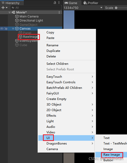 Hierarchy视图,鼠标右键新建UGUI-RawImage
