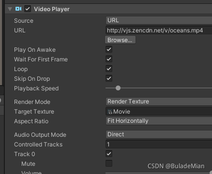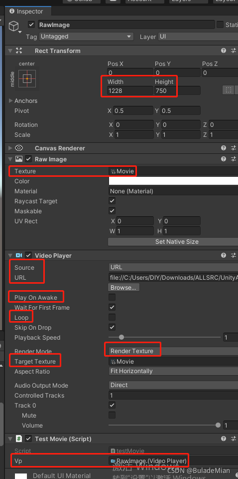 RawImage的Texture,VideoPlayer的TargetTexture都是上面刚刚创建的名字为Movie的Render Texture