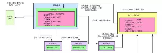 如上图所示,库存服务、仓储服务、积分服务中都有一个Eureka Client组件,这个组件专门负责将这个服务的信息注册到Eureka Server中。说白了,就是告诉Eureka Server,自己在哪台机器上,监听着哪个端口。而Eureka Server是一个注册中心,里面有一个注册表,保存了各服务所在的机器和端口号