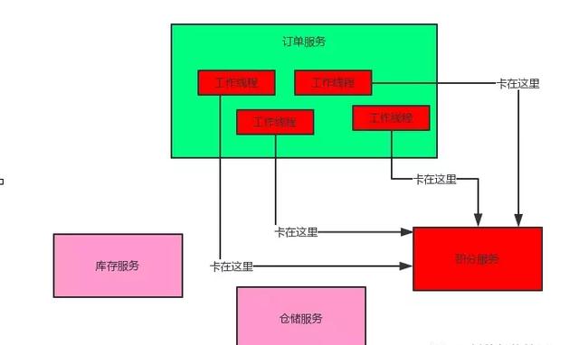 当然会导致订单服务里的那个用来调用积分服务的线程都卡死不能工作了啊!但是由于订单服务调用库存服务、仓储服务的这两个线程池都是正常工作的,所以这两个服务不会受到任何影响。