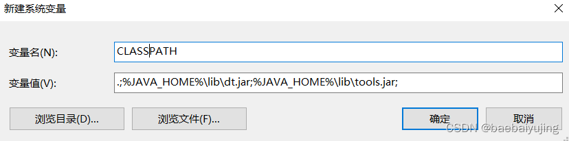 新建“CLASSPATH”变量,变量值为“.;%JAVA_HOME%\lib\dt.jar;%JAVA_HOME%\lib\tools.jar;”