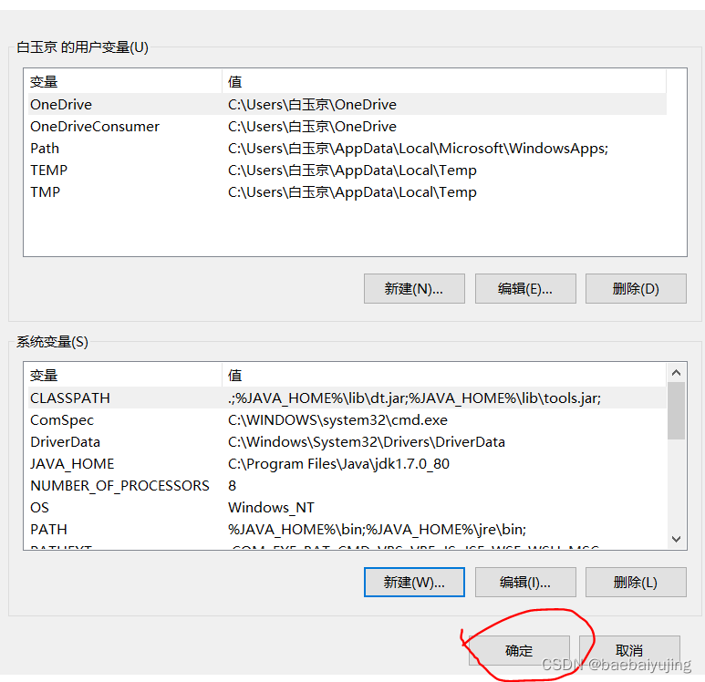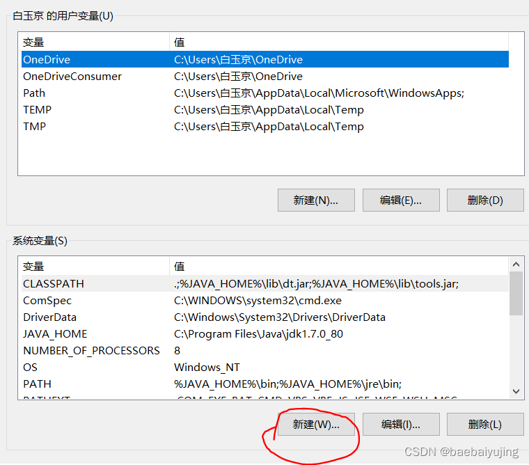 5.新建“JAVA_HOME”变量,变量值为你的JDK软件安装路径“C:\Program Files\Java\jdk1.7.0_80”