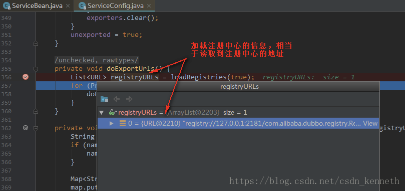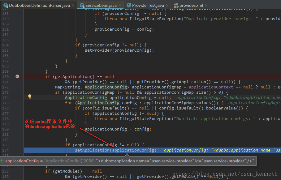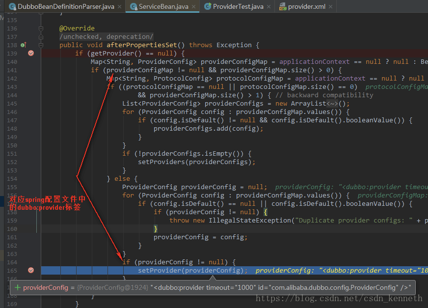 剩下的标签就不再举例。afterPropertiesSet就是把spring配置文件中dubbo的标签内容保存起来。保存在ServiceBean里面。