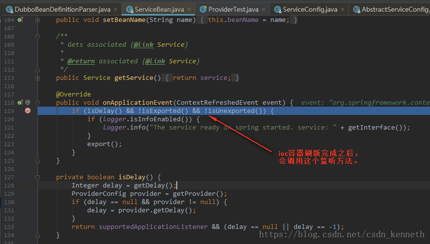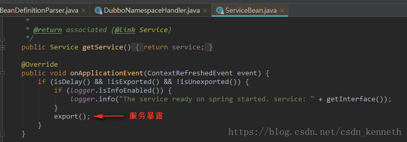 ServiceBean还实现了ApplicationListener<ContextRefreshedEvent>接口,叫应用的监听器。它监听的事件是ContextRefreshedEvent,当我们ioc容器整个刷新完成,也就是ioc容器里面所有对象都创建完成以后来回调方法onApplicationEvent(ContextRefreshedEvent event)。
