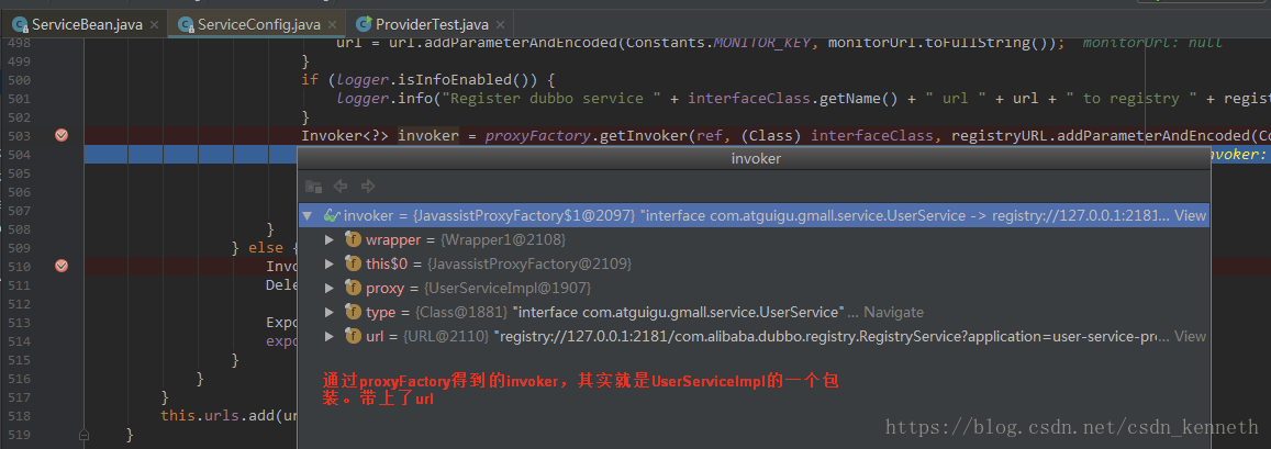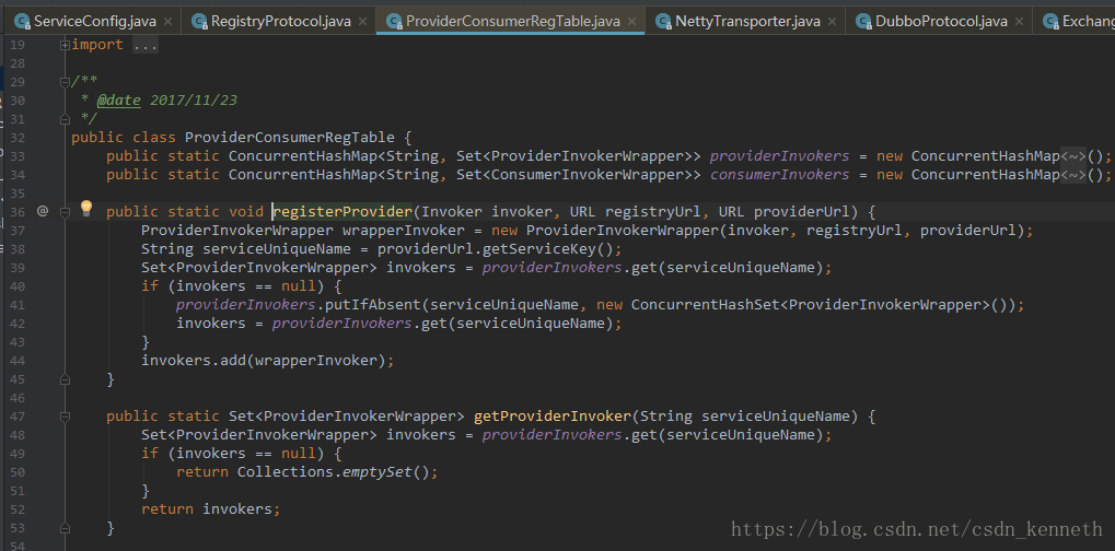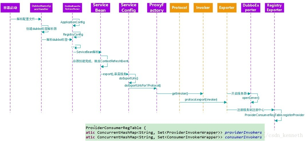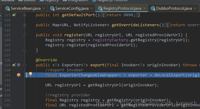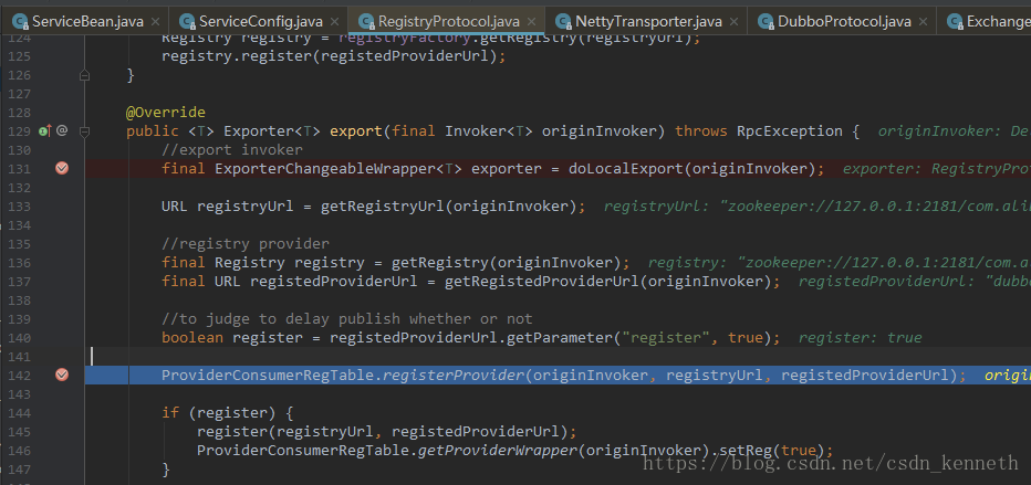 在暴露服务的时候,要获取到invoker(下图getInvoker()),再用exporter来暴露执行器。Exporter会用两个,dubboExporter和registryExporter。DubboExporter来开启netty服务器,registryExporter用来注册,服务(执行器)和对应的url地址,注册到注册表里。