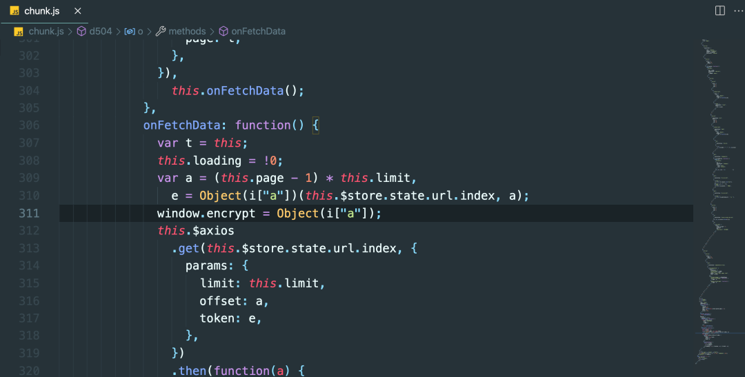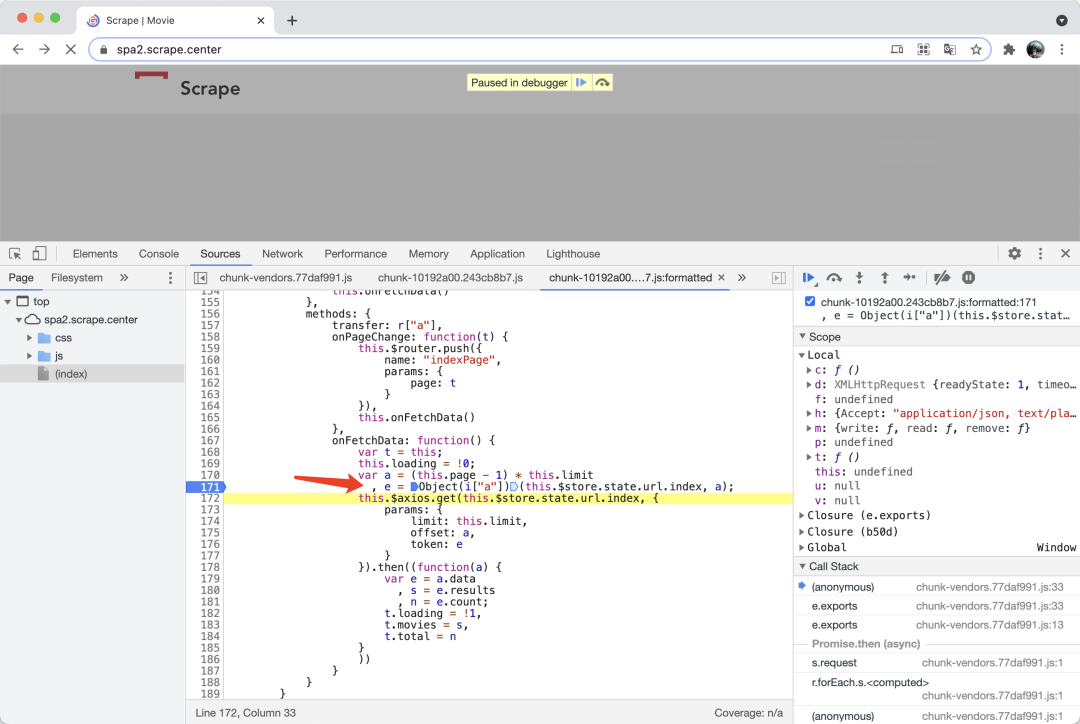 经过对比观察可以容易地发现,变量 a 其实就是请求数据的 offset,数据一页 10 条,所以第一页 offset 就是 0,第二页 offset 就是 10,所以变量 a 就是 0、10,以此类推。this.$store.state.url.index 是一个固定的字符串 /api/mobie,但是经过调用 Object(i['a']) 方法之后,结果 e 也就是最终的 token 就得到了。