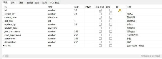 DROP TABLE IF EXISTS `sys_quartz_job`; CREATE TABLE `sys_quartz_job` ( `id` varchar(32) CHARACTER SET utf8 COLLATE utf8_general_ci NOT NULL, `create_by` varchar(32) CHARACTER SET utf8 COLLATE utf8_general_ci NULL DEFAULT NULL COMMENT '创建人', `create_time` datetime NULL DEFAULT NULL COMMENT '创建时间', `del_flag` int(1) NULL DEFAULT NULL COMMENT '删除状态', `update_by` varchar(32) CHARACTER SET utf8 COLLATE utf8_general_ci NULL DEFAULT NULL COMMENT '修改人', `update_time` datetime NULL DEFAULT NULL COMMENT '修改时间', `job_class_name` varchar(255) CHARACTER SET utf8 COLLATE utf8_general_ci NULL DEFAULT NULL COMMENT '任务类名', `cron_expression` varchar(255) CHARACTER SET utf8 COLLATE utf8_general_ci NULL DEFAULT NULL COMMENT 'cron表达式', `parameter` varchar(255) CHARACTER SET utf8 COLLATE utf8_general_ci NULL DEFAULT NULL COMMENT '参数', `description` varchar(255) CHARACTER SET utf8 COLLATE utf8_general_ci NULL DEFAULT NULL COMMENT '描述', `status` int(1) NULL DEFAULT NULL COMMENT '状态 0正常 -1停止', PRIMARY KEY (`id`) USING BTREE ) ENGINE = MyISAM CHARACTER SET = utf8 COLLATE = utf8_general_ci ROW_FORMAT = DYNAMIC; 复制代码