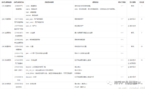 规则表中,渠道限制、对象限制、金额限制和数量限制四者皆属于限制型规则,优先级排在了较前面。同时,也给出了参数说明,规则描述,相对于模板的关系以及互斥规则。