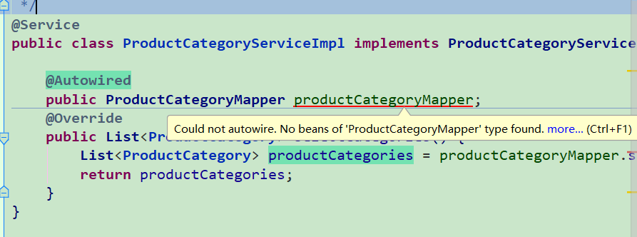 今天在写springboot案例的时候发现了Could not autowire. No beans of 'ProductCategoryMapper' type found.