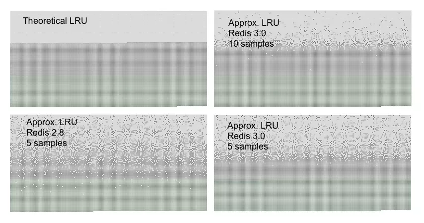 我们能看到Redis3.0采样数是10生成的图最接近于严格的LRU。而同样使用5个采样数,Redis3.0也要优于Redis2.8。