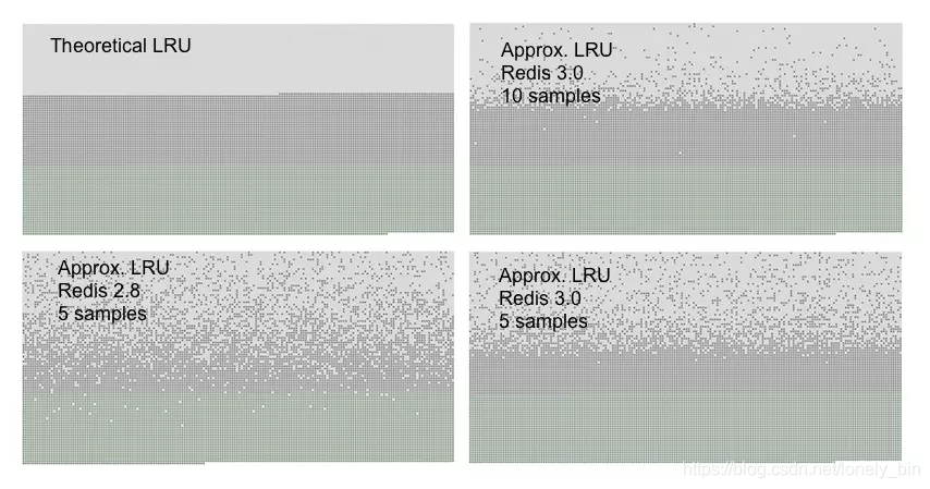 我们可以通过一个实验对比各LRU算法的准确率,先往Redis里面添加一定数量的数据n,使Redis可用内存用完,再往Redis里面添加n/2的新数据,这个时候就需要淘汰掉一部分的数据,如果按照严格的LRU算法,应该淘汰掉的是最先加入的n/2的数据。