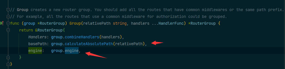 现在来看Group的实现,通过调用这个方法会产生一个新的RouterGroup 并根据参数设置的基础路径,和全局engine实体,并把基础的中间件也复制到其中。