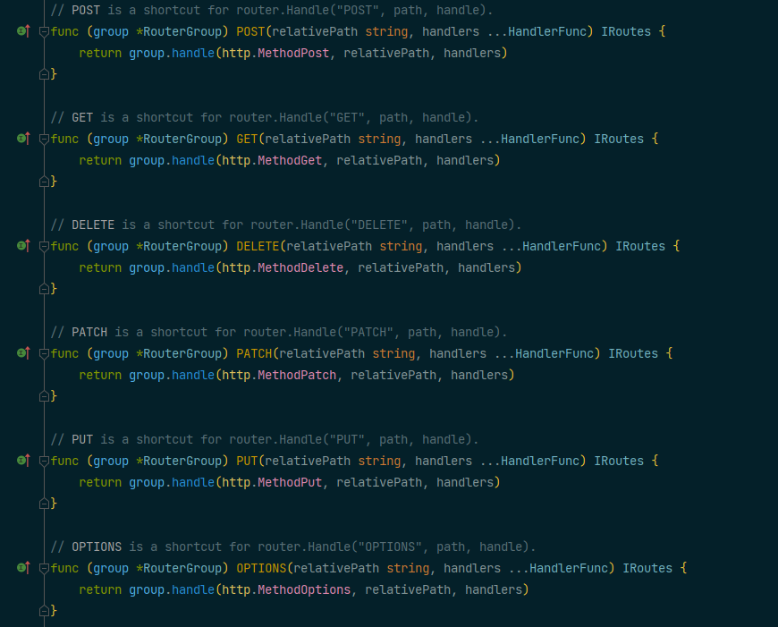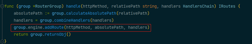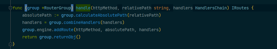 使用分组路由最后也是调用group.handle方法进行注册,只是其中的basePath在分组的时候已经设置好了,加上注册函数时的路径,就是这个请求的路由路径。