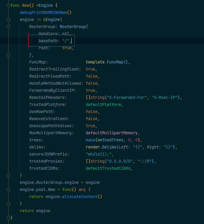 在gin.New() 函数中我们可以看到 basePath 默认是 /