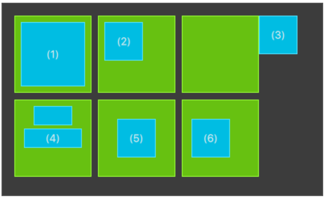 您会看到 (1) 无法拖动,因为它已锚定在所有侧面,确保您可以拖动 (1) 的父项,因为它根本没有锚定。 (2) 可以垂直拖动,因为只有左侧被锚定。 类似地适用于(3)。 (4) 只能垂直拖动,因为两个方块都是水平居中的。 (5) 以父级为中心,因此不能拖动,与 (7) 类似。 拖动元素意味着改变它们的 x,y 位置。 由于锚定比 x,y 等几何变化更强,因此拖动受锚定线的限制。 我们稍后会在讨论动画时看到这种效果。