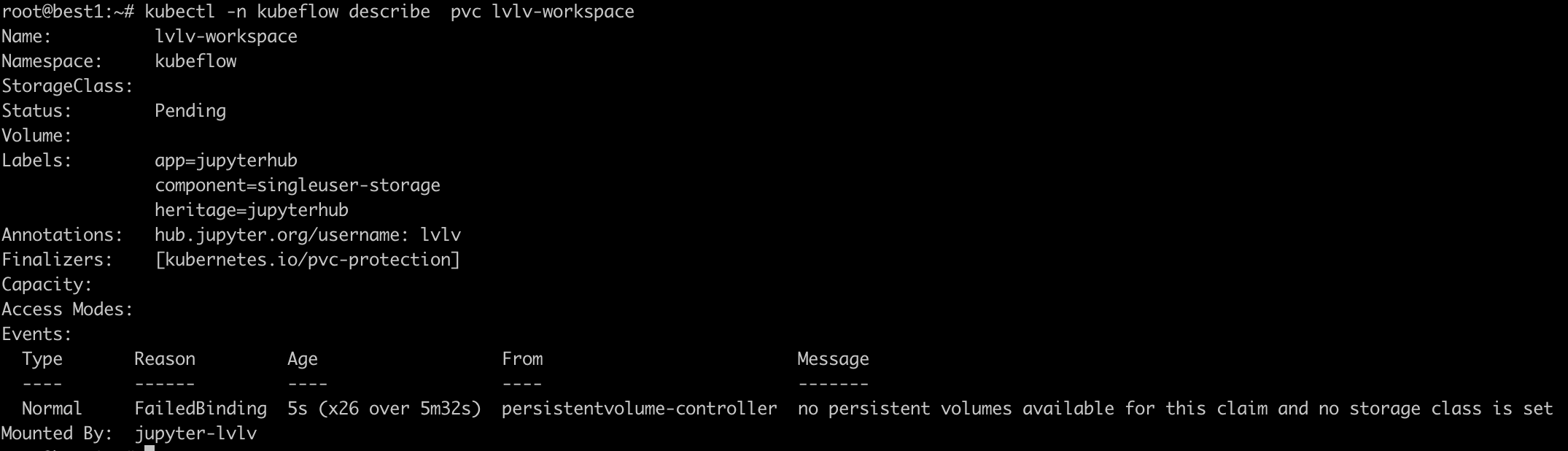 确实有一个pvc在pending状态,也能理解,Jupyter Nodebook是需要存储用户代码的,所以建立pvc应该是再正常不过了,可是为啥penging呢,