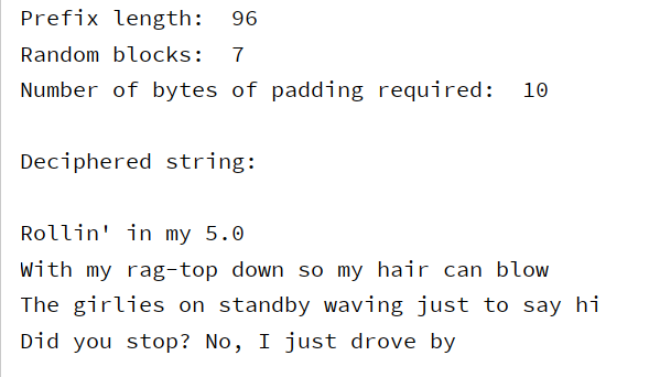 prefix_length = len(os.path.commonprefix([encryptor(b'AAAA', IV, random_key), encryptor(b'', IV, random_key)]))