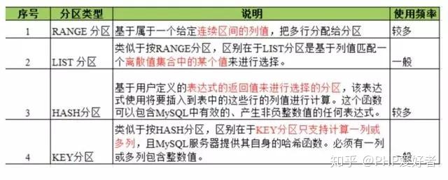 查询时,对银行卡做索引,业务编号做索引,证件号做索引。随着需求大增多,这张表的索引会达到10个以上。而且客户解约再签约,里面会保存两条数据,只是绑定的状态不同。 假设我们有5千万的客户,5个业务类型,每位客户平均2张卡,那么这张表的数据量将会达到惊人的5亿,事实上我们系统用户量还没有过百万时就已经不行了。这样的设计绝对是不行的,无论是插入,还是查询,都会让系统崩溃。mysql数据库中的数据是以文件的形势存在磁盘上的,默认放在/mysql/data下面(可以通过my.cnf中的datadir来查看), 一张表主要对应着三个文件,一个是frm存放表结构的,一个是myd存放表数据的,一个是myi存表索引的。这三个文件都非常的庞大,尤其是.myd文件,快5个G了。下面进行第一次分区优化,Mysql支持的分区方式有四种: