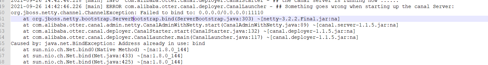 1.当在一台服务器上同时启动这两个canal服务时,第一个正常启动,另一个的canal.log报错如下
