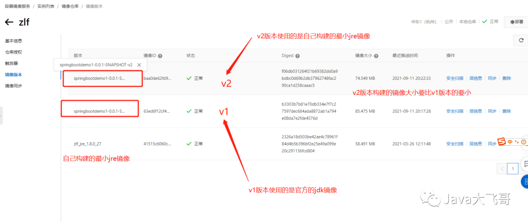 分别使用自己构建的最小jre镜像打的tag为v2版本