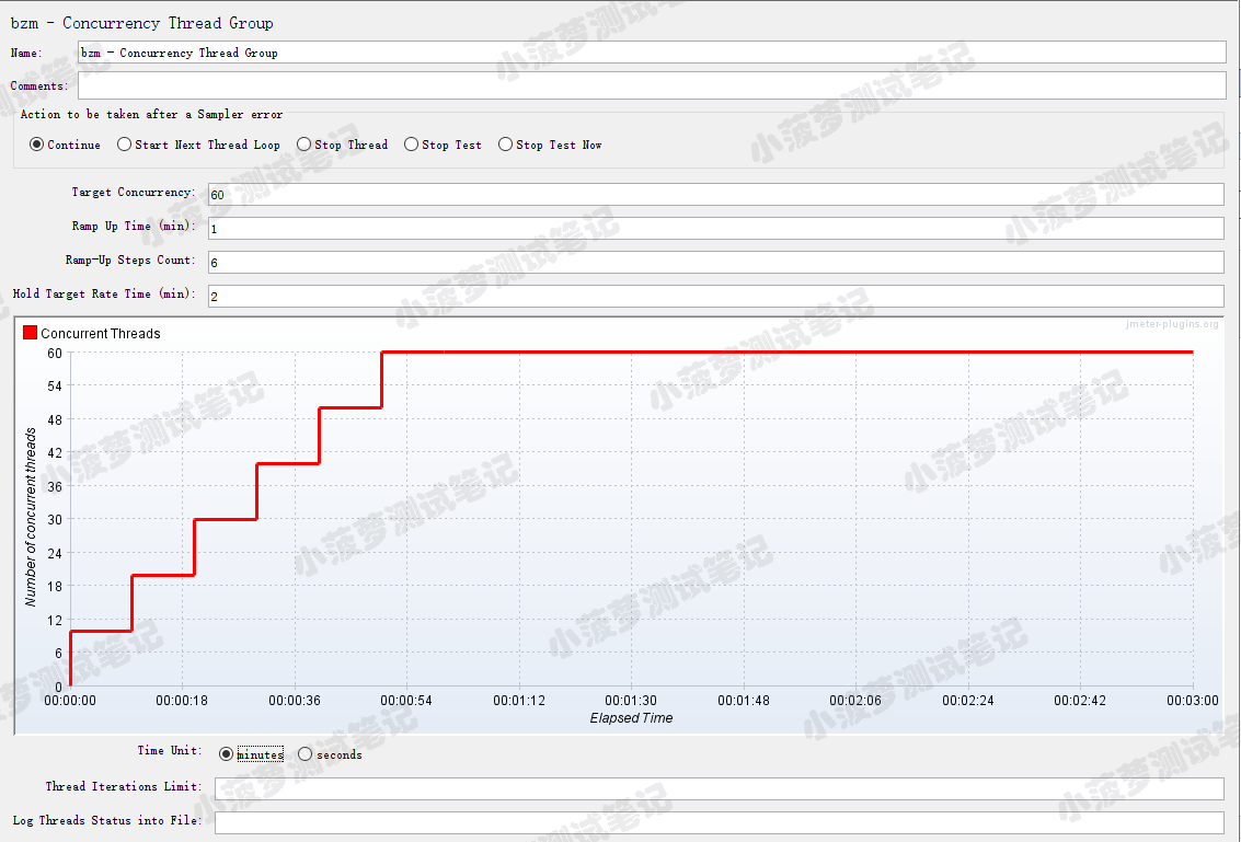 - Ramp-Up Steps Count:阶梯次数;若设置 6 ,则目标线程在 1min 内分六次阶梯加压(启动线程);每次启动的线程数 = 目标线程数 / 阶梯次数 = 60 / 6 = 10