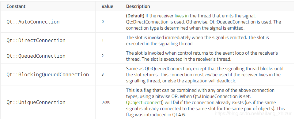 当然,connect有多重函数重载形式,以上只是其中的一种。其中的第五个参数type指明了signal-slot的连接方式,Qt::ConnectionType有一些几种类型:
