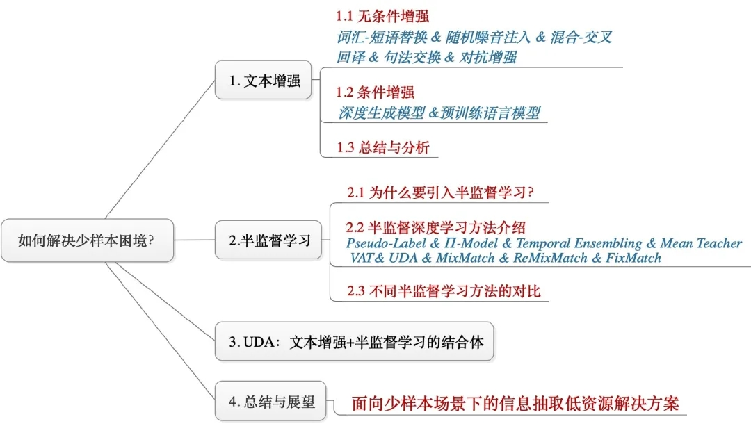 本文针对「如何解决少样本困境?」,从「文本增强」和「半监督学习」两个角度进行了介绍,简单总结如下: