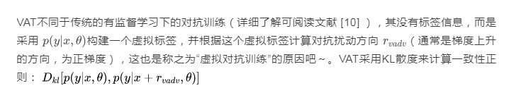 Virtual Adversarial Training(VAT)仍然采用一致性正则,学习一致性就要添加扰动。作者认为,随机扰动无法模拟复杂情况的输入,不同于上述SSL方法采用数据增强进行施加扰动,VAT采取对抗训练的方式添加噪音。