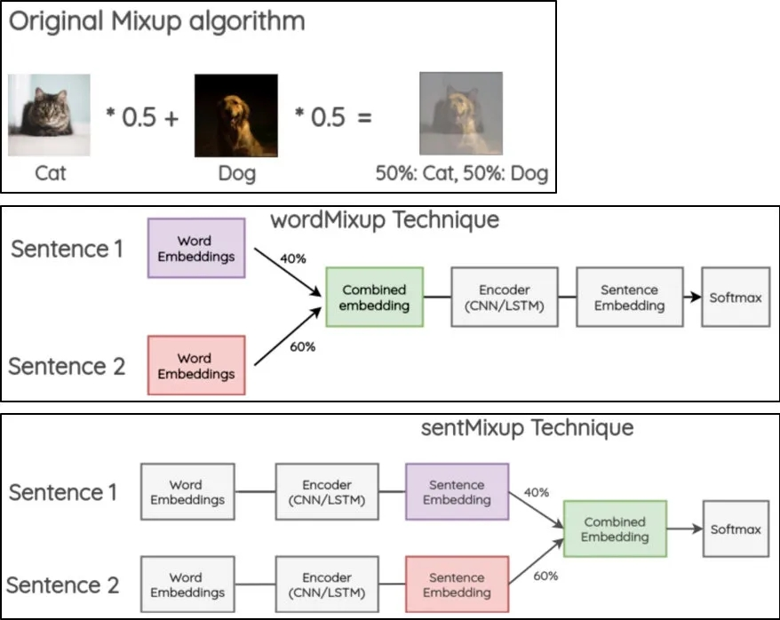 混合增强:起源于图像领域的Mixup[5],这是一种表示增强方法,借鉴这种思想,文献[6]提出了wordMixup和sentMixup将词向量和句向量进行Mixup。