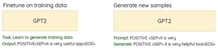 LAMBADA [14]:来自IBM团队,其基于GPT-2将标签信息与原始文本拼接当作训练数据进行finetune(如下图所示,SEP代表标签和文本的分割,EOS是文本结束的标志),同时也采用一个判别器对生成数据进行了过滤降噪。