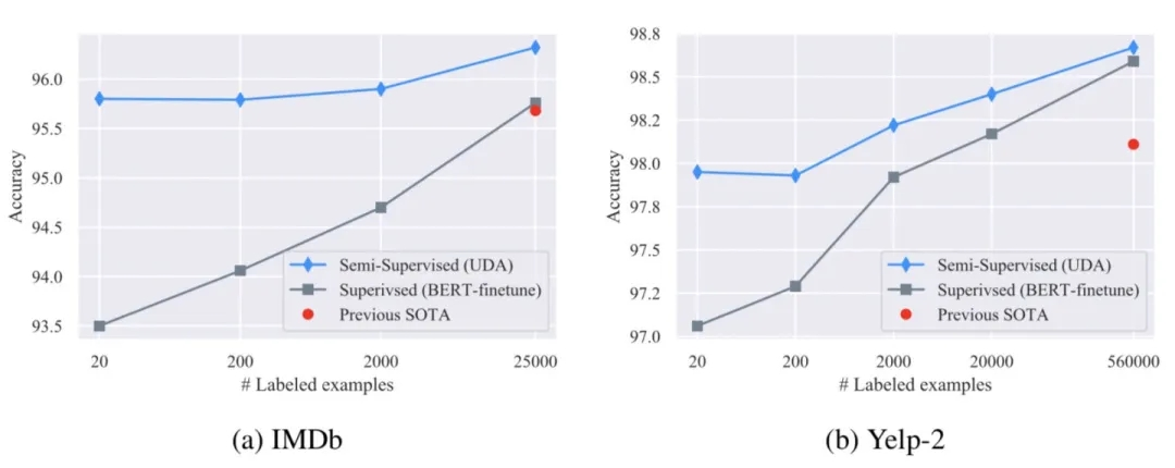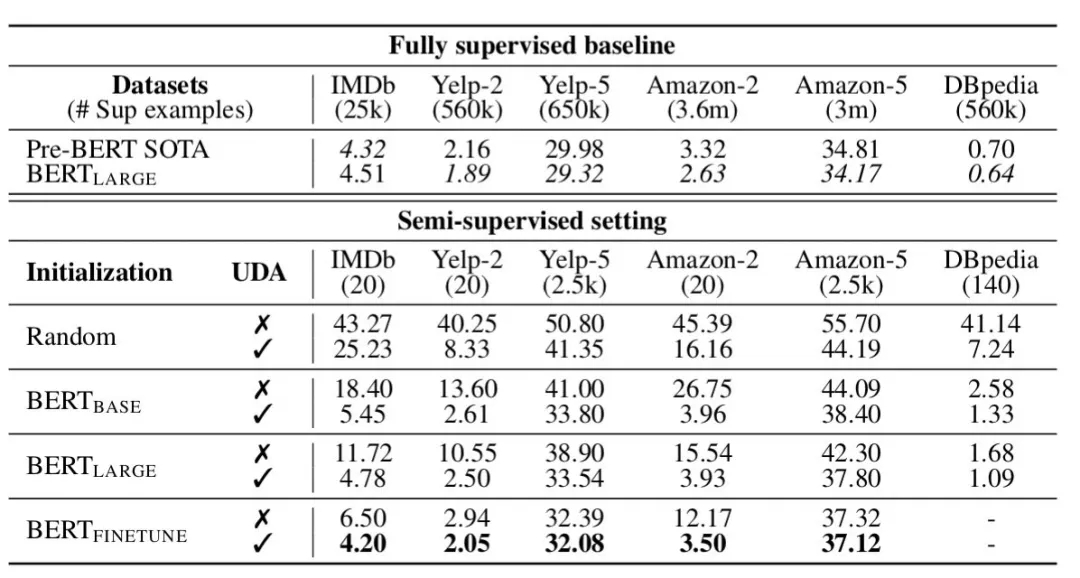 1)在少样本场景下,UDA相较于同等监督学习模型,性能明显提升;