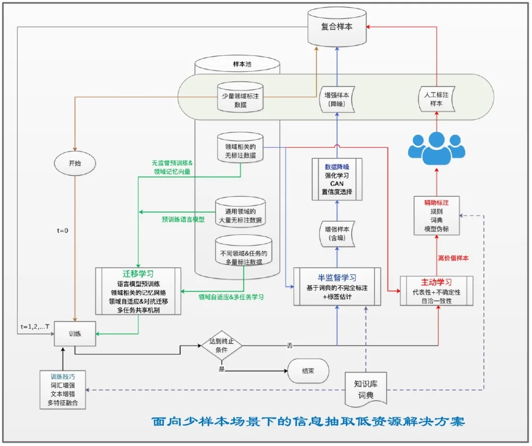 在具体实践中,如何有效地解决少样本问题需要更为全面的考虑,我们可以融合文本增强、半监督学习、迁移学习、主动学习、少样本学习等构建统一的低资源NLP解决方案;如上图所示,笔者尝试给出了信息抽取领域的少样本低资源解决方案;此外,很多弱监督学习方法也被提出,这一类方法更为关键的是如何挑选样本、如何降噪学习等,希望后续有机会与大家交流~
