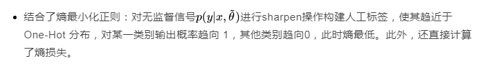 2)Strong Augmentation: MixMatch不稳定的原因可能是K次weak增强会导致不同的预测,取平均值不是具有意义的目标;ReMixMatch改进这一点,引入strong增强,将weak增强后的人工标签与strong增强后的预测标签共同构建一致性正则(KL散度)。具体的增强方式CTAugment 可参考原论文。