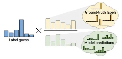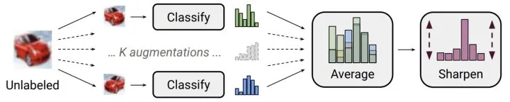 1)Distribution Alignment: 分布对齐,将无标注数据的人工标签与标注数据的标签分布对齐,如上图所示:根据标注数据的标签分布(Groud-truth labels)与无标注数据的平均预测(Model prediction)的比值作为“对齐因子”,缓解猜测标签的噪音和分布不一致情况。
