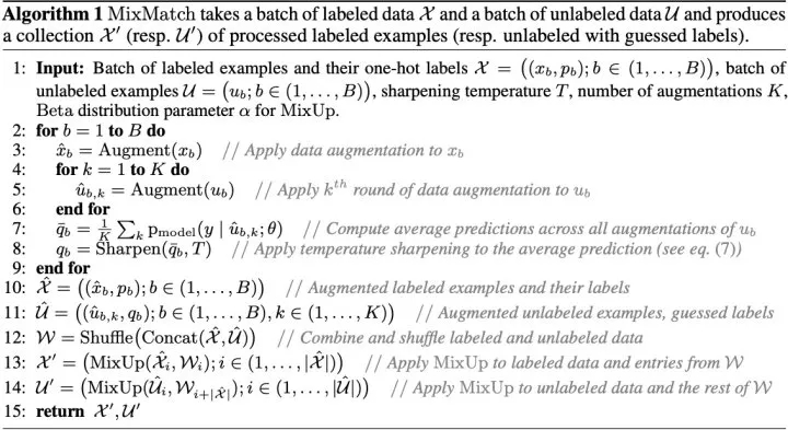 MixMatch同样来自Google,与UDA类似,同样结合了熵最小化和一致性正则。其重要的操作就是通过MixMatch进行数据增强,与UDA的RandAugment不同,这种增强方式依然是weak的。MixMatch具体的数据增强操作为: