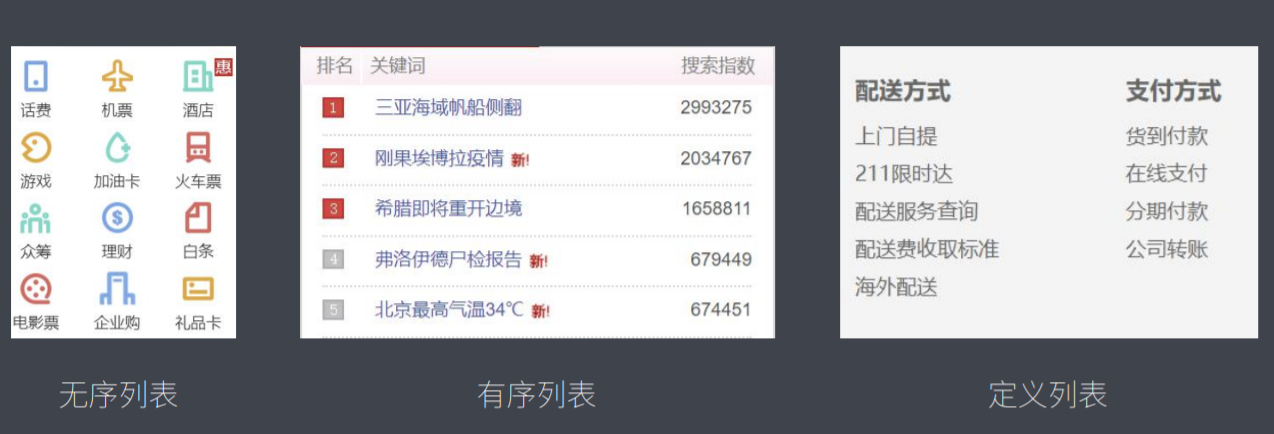<head>头部标签<nav>导航标签<main>主体标签<article>独立的内容标签<section>区段标签<aside>侧边栏标签