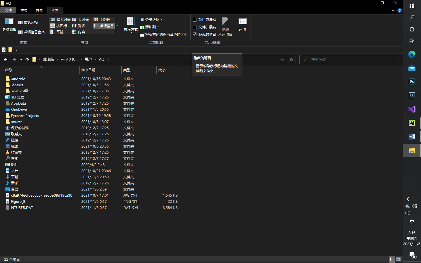 其中AQ为你的账号名,AppData为隐藏文件夹,在文件查找中勾选隐藏项目可查看