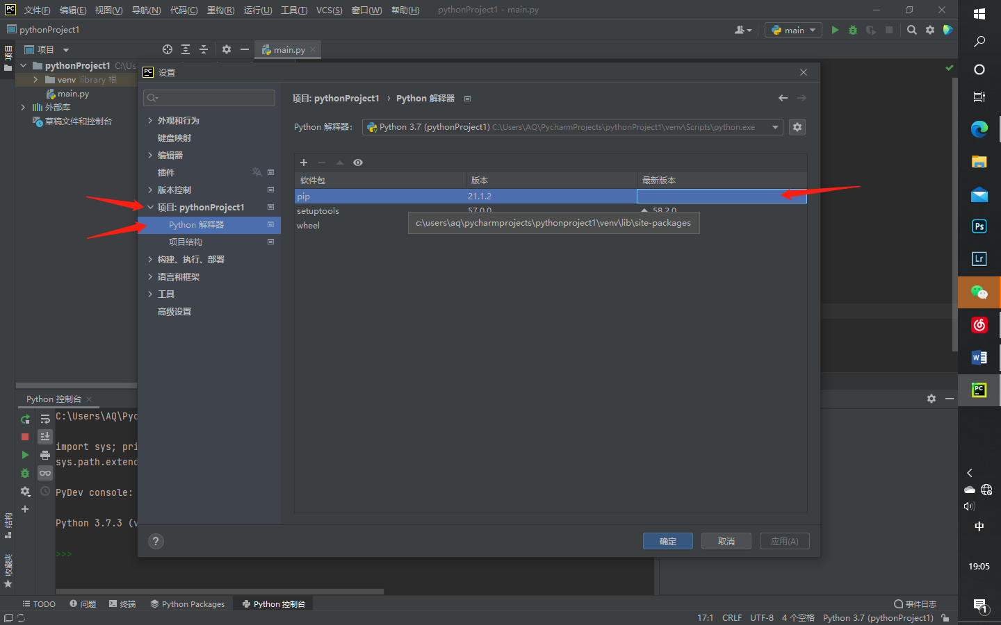 回到项目解释器面可以找到pip选项(若找不到则可能是版本问题,卸载已安装的解释器,重新安装其他版本的解释器),双击进入,一开始选择的是pip库,点击安装包进行更新