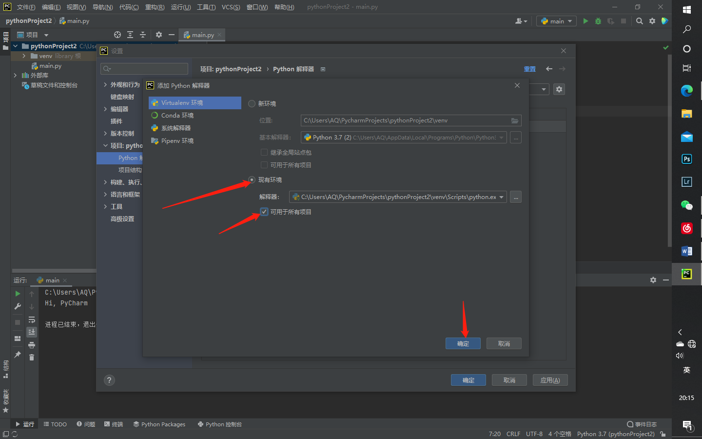 在添加中选择virtualenv环境,选择现有环境,一般会自动检测到python所安装位置,若没有则点击右边的…添加,具体操作见文末。