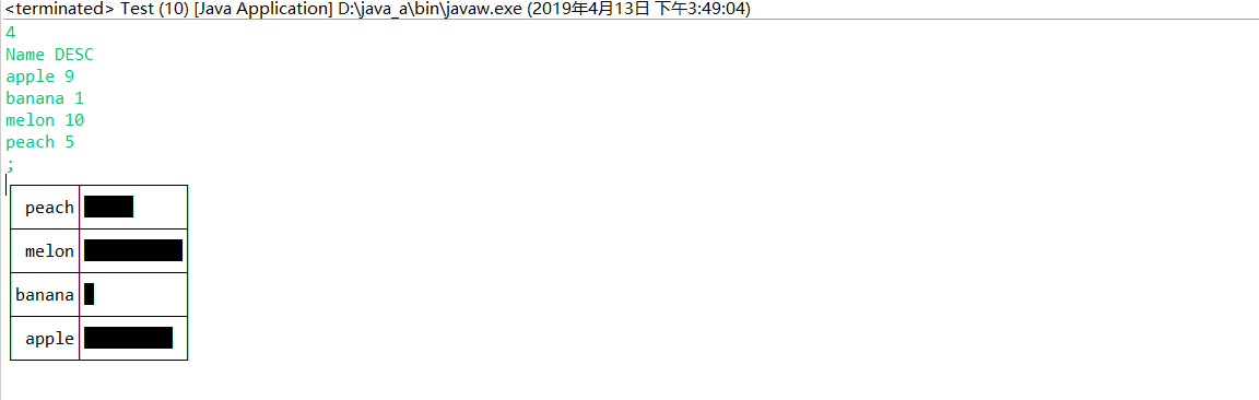 ┌─────────┬────────────────────┐ │pineapple│████████████████████│ ├─────────┼────────────────────┤ │ apple│██████████ │ ├─────────┼────────────────────┤ │ pen│██████ | └─────────┴────────────────────┘