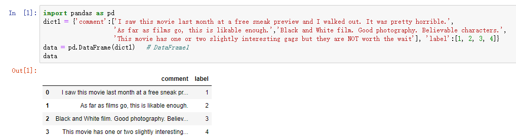 数据大概是这样的,DataFrame1是评论数据及评论对应的标签,如下图: