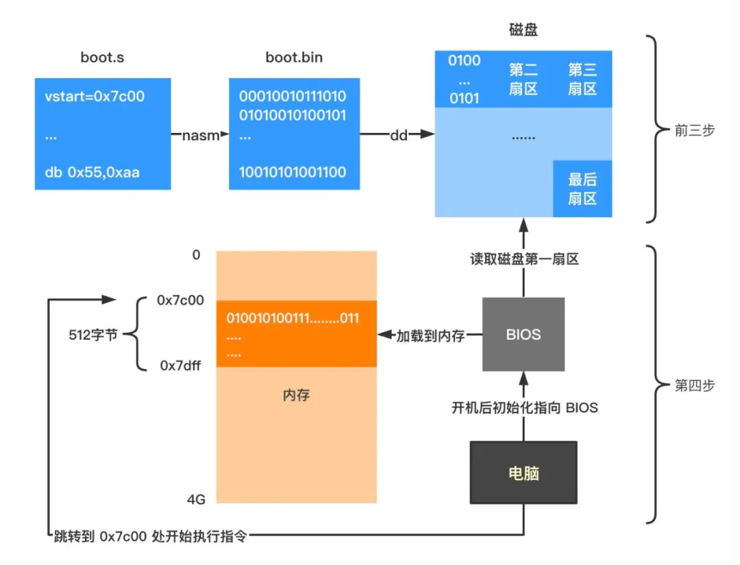 总结起来真是简单得要死,把汇编语言写的 boot.s 文件编译成纯二进制格式的文件boot.bin,再把这个纯二进制文件写入磁盘(用 bochs 生成的虚拟硬盘文件 os.raw)的第一扇区,最后用 bochs 启动电脑即可。