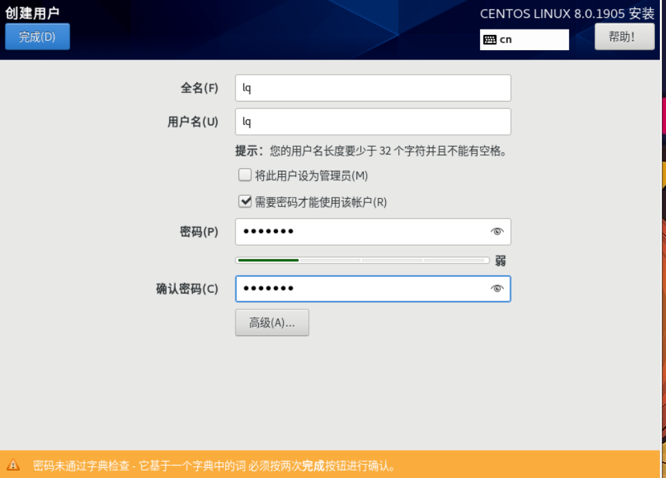 设置用户名密码-创建以后就会重启,最好是最后一步进行操作