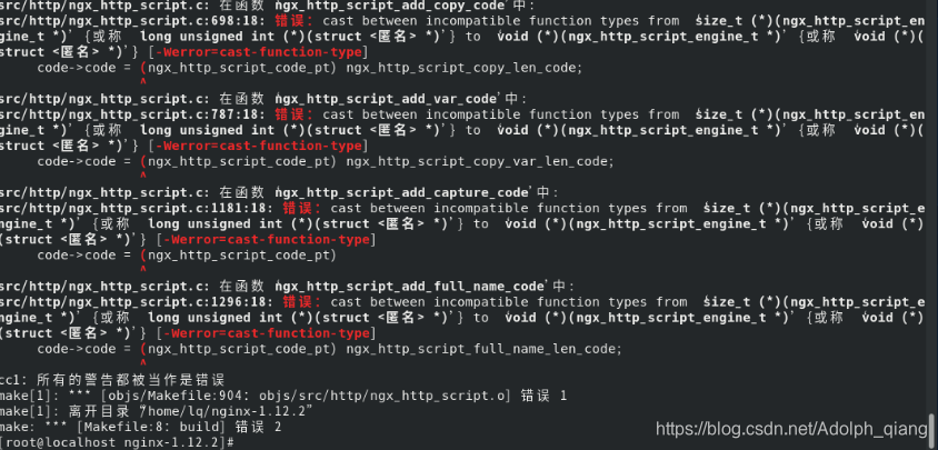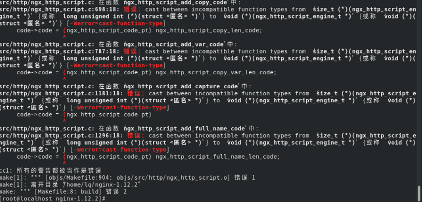 解决方法:打开 gedit objs/Makefile 把 -Werror删掉 (-Werror,它要求GCC将所有的警告当成错误进行处理)