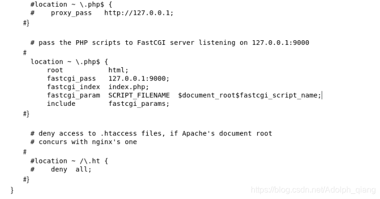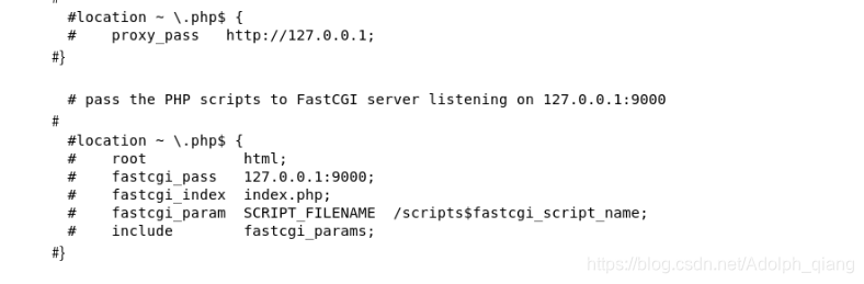 接着就看到开启PHP支持的配置,可以看出将所有以.php结尾的请求都交给FastCGI模块处理,其监听端口为9000,而就像上面讲的,FastCGI模块将变量映射成PHP变量,将请求交给了PHP—fpm来处理,当用户对Nginx发起PHP请求时,Nginx首先从80端口接收到PHP请求,然后将该请求发送给9000端口,经FastCGI模块处理交给了在监听9000端口的PHP-fpm,PHP-fpm的master进程将PHP执行任务交个下面的worker进程,worker进程使用内嵌的php解释器来执行PHP并将获得的结果层层返回,最终通过Nginx发出,结果就显示在用户眼前了