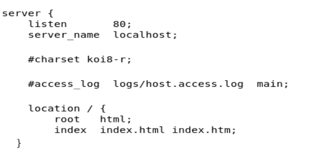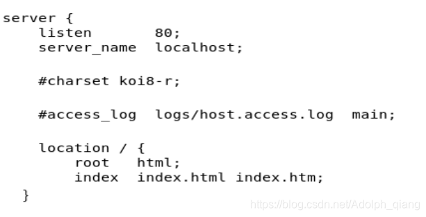 可以看出,Nginx新建了一个虚拟主机,监听80端口的请求,根目录为html(/usr/local/nging/html),默认主页为index.html或index.htm