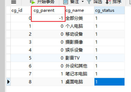 cg_id是主键,cg_parent是代表父分类pid
