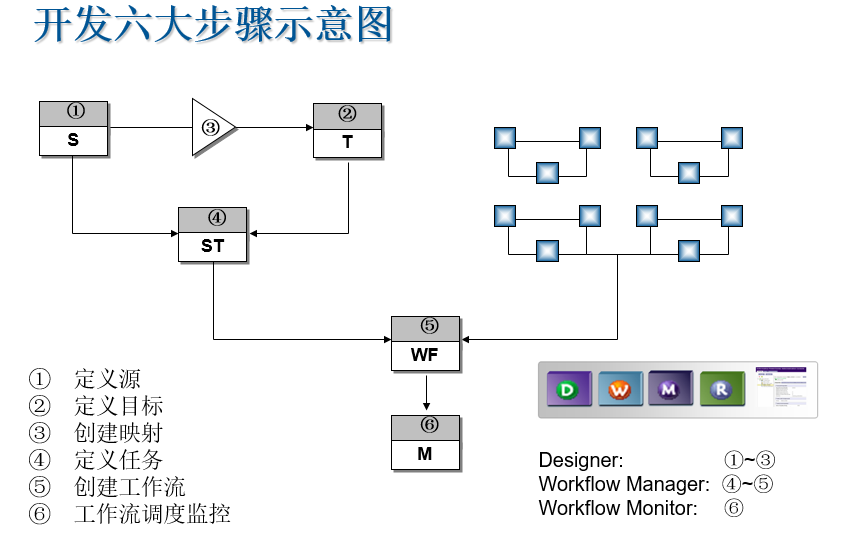 Informatica——ETL基本开发流程Informatica开发六大步骤示意图:第一步:定义数据源:第二步:定义目标target:第三步:创建映射:第四步:定义任务:第五步:定义工作流:第六步:工作流调度监控: 版权声明:本文为lb08241原创文章,遵循CC 4.0 BY-SA版权协议,转载请附上原文出处链接和本声明。原文链接:https://blog.csdn.net/lb08241/article/details/106376630