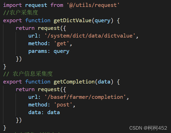 4.创建api文件夹 ,在api文件夹下创建接口文件colllect.js,文件中引入src中的request.js文件,创建接口函数,区分get方法和post方法所传入参数的不同