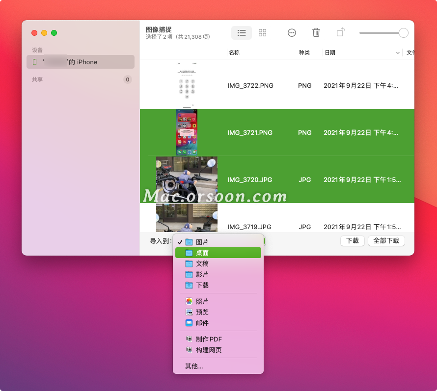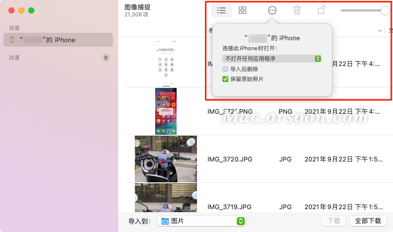 图像捕捉 App 窗口右上角还有一些选项,比如以列表或图标显示照片,导入完成后是否删除iPhone 里的原照片等。